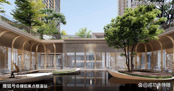 外立面采用为棕红色线条搭配大面积玻璃,小区内部有大面积景观树和水景,整体绿化高。