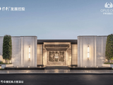 建筑立面采用浅灰色基底+晨曦金边框,局部搭配石材、铝板及LOW-E玻璃