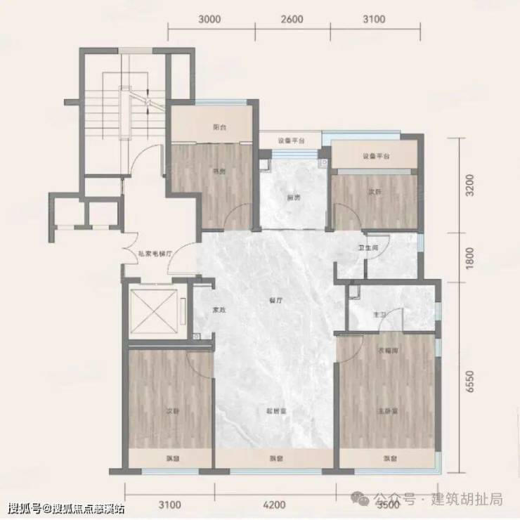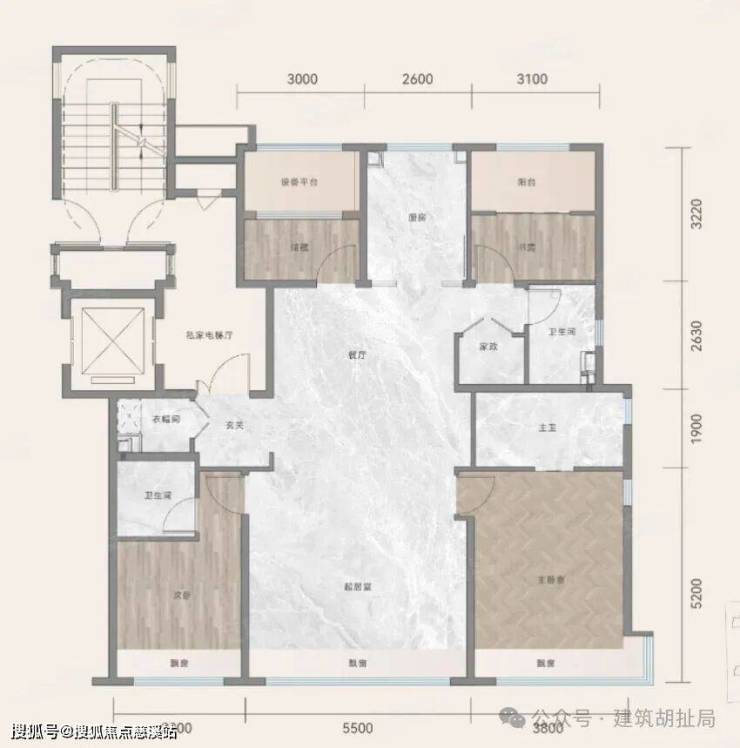 158户型相比的126户型大格局基本一致,就是客厅是5.5米宽厅了。电梯贯通梯,多了私家电梯厅和入户玄关,归家更私密,仪式感更强了。电梯厅还是个暗厅,要是明厅就好了。