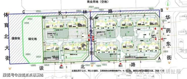 用地东侧是华药东街,道路设计宽度40米,西侧能通过南边两侧的规划路直接联通到体育大街上。北侧长林路、中间长生路道路宽度都是15米,南侧谈北路宽度25米。对于这种规模的小区,交通是十分便利的,但是也带来个问题就是所有住宅都是临路的,没有一栋楼能避免,地块太小了没办法,跟南边地块一个毛病。不过这里也算这一大片地的内部道路了,到时候情况应该还好。另外地块北边是商业用地,未来不知道如何规划,什么业态。要是真商业的话,北侧道路不知道是否有干扰。(要是商墅那就完美了,不过应该不是,当时这块住宅跟商业是打算一块出让的,没人想要商业地,最后只好分开了)