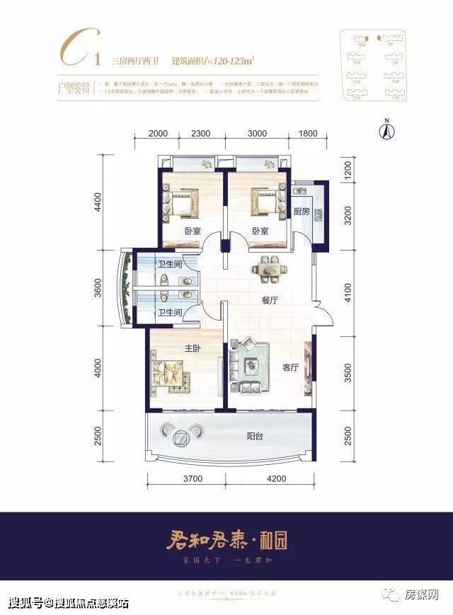 C1户型,三房两厅两卫,建面约120-123㎡。