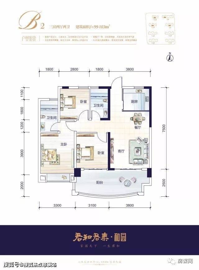 B2户型,三房两厅两卫,建面约99-103㎡。