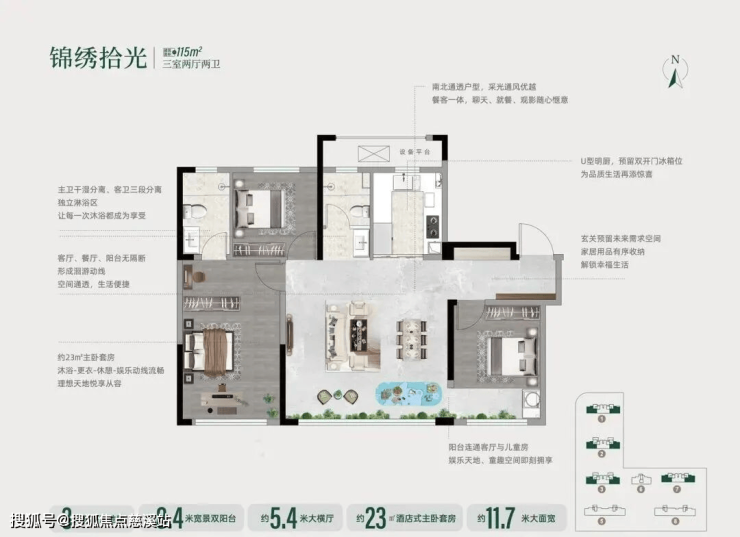 【115㎡三室两厅两卫】:分布在1/2/3/7号楼的边户。约11.7米大面宽,约8.4米宽景双阳台,约5.4米大横厅,3面落地窗,约23㎡主卧套房。