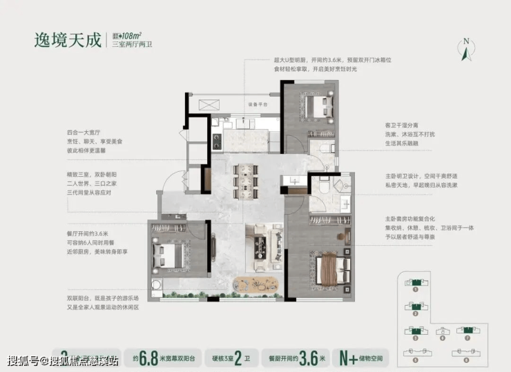 【108㎡三室两厅两卫】:分布在1/2/3/7号楼的中间户。四合一大宽厅,约6.8米宽幕双阳台,3面落地窗,餐厨开间约3.6米,主卧套房明卫。