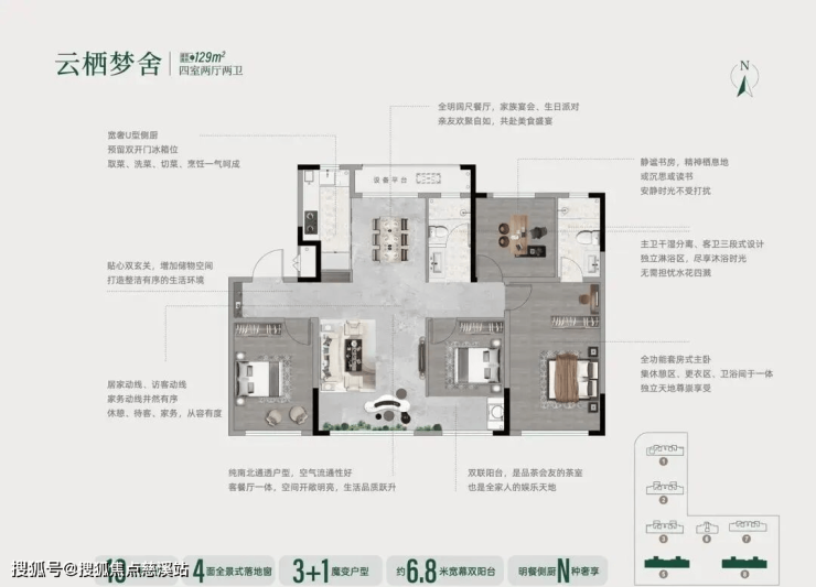 【129㎡四室两厅两卫】:分布在5/8号楼。10层洋房,3+1式灵活户型,4面全景落地窗,约6.8米宽幕双阳台。