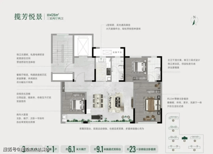 【126㎡三室两厅两卫】:分布在6号楼。一梯一户,约6.1米大横厅,约9.1米跑道式双阳台,3面落地窗,约23㎡总统级主卧套房。