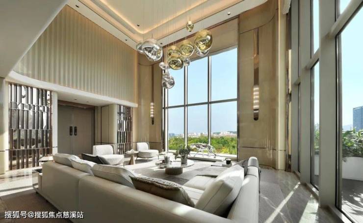 项目创新研发“空中平墅”产品,在横向面宽延展超20米的设计下,突破平面束缚向上延伸,打造了约6.6米挑空、200m³立体客厅,将别墅的垂直尺度与大平层的横向尺度融合,创造平层“墅居”的生活体验。