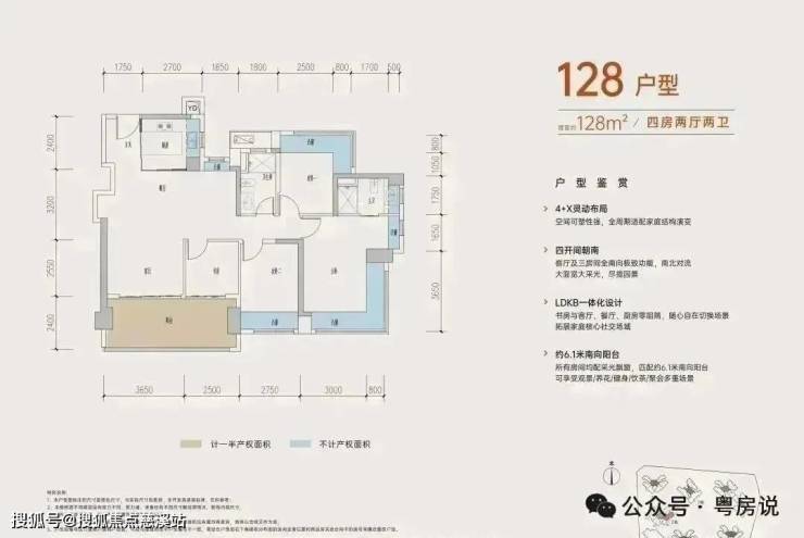 128㎡的4房2厅2卫,设计的是经典竖厅格局,进门入户玄关,客厅3.65米开间,四开间朝南,动静分区,主卧+1个次卧270度大飘窗,客厅连接次卧出6.15米长大阳台,4个卧室分别做到了主卧20.14㎡/次卧11.28㎡/次卧10.58㎡/次卧6.37㎡(包含墙体飘窗),得房率约:77.39%(不含赠送),东南朝向。赠送面积21.54㎡,加上赠送得房率94.45%。