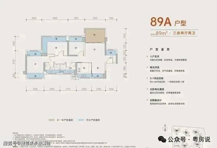 89㎡的3+1房2厅2卫,A户型,设计的是竖厅南北通透格局,进门入户玄关,客厅3.5米开间,,五开间朝南,主卧南北通透双飘窗,3个卧室分别做到了主卧15.73㎡/次卧14.08㎡/次卧8.96㎡(包含墙体飘窗),得房率约:77.39%(不含赠送),阳台主朝东北向,这次推出最靓的户型可以改4房,赠送面积24.5㎡,加上赠送得房率高达104.87%。