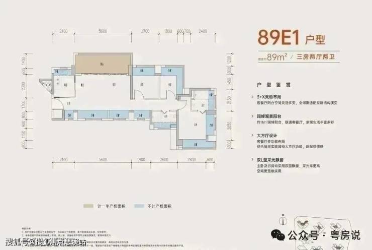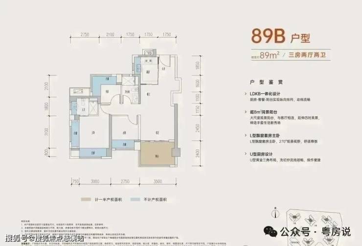 89㎡的3房2厅2卫,B户型,设计的是经典竖厅格局,进门入户玄关,客厅3.5米开间,三开间朝南,,主卧+1个次卧270°飘窗,3个卧室分别做到了主卧15.1㎡/次卧8.52㎡/次卧7.77㎡(包含墙体飘窗),得房率约:77.39%(不含赠送),西南朝向。赠送面积16.96㎡,加上赠送得房率96.84%。