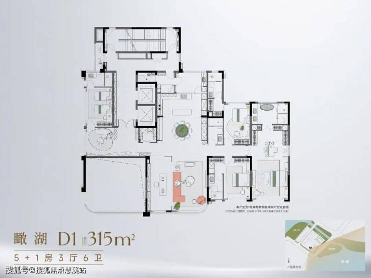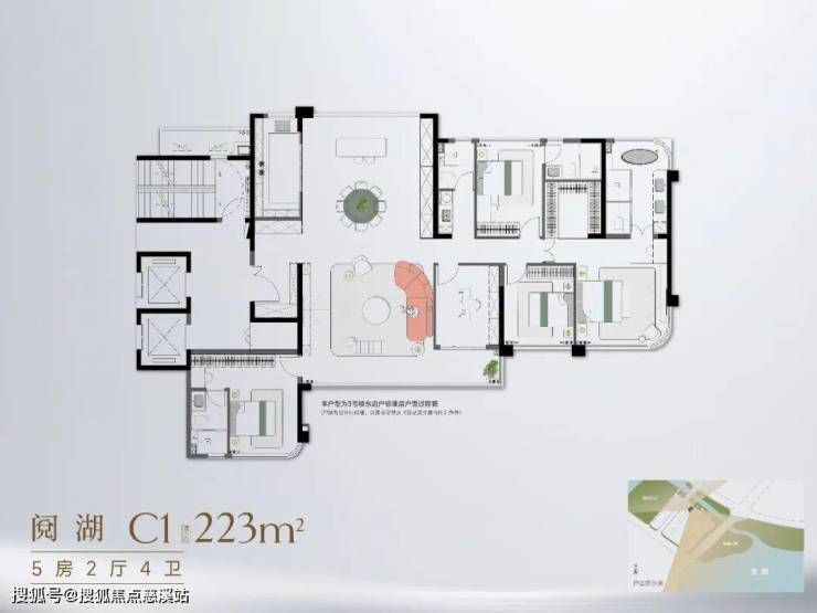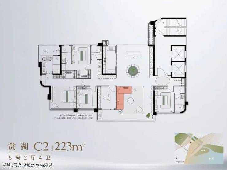 约223㎡五房:双电梯独立入户,五开间朝东南,四面宽看湖,家族共居也能各自私密。