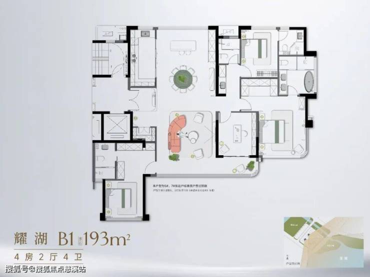 约193㎡四房:独梯独户+三套房设计,主卧与阳台转角窗,一面看湖,一面看园,视野独一无二。