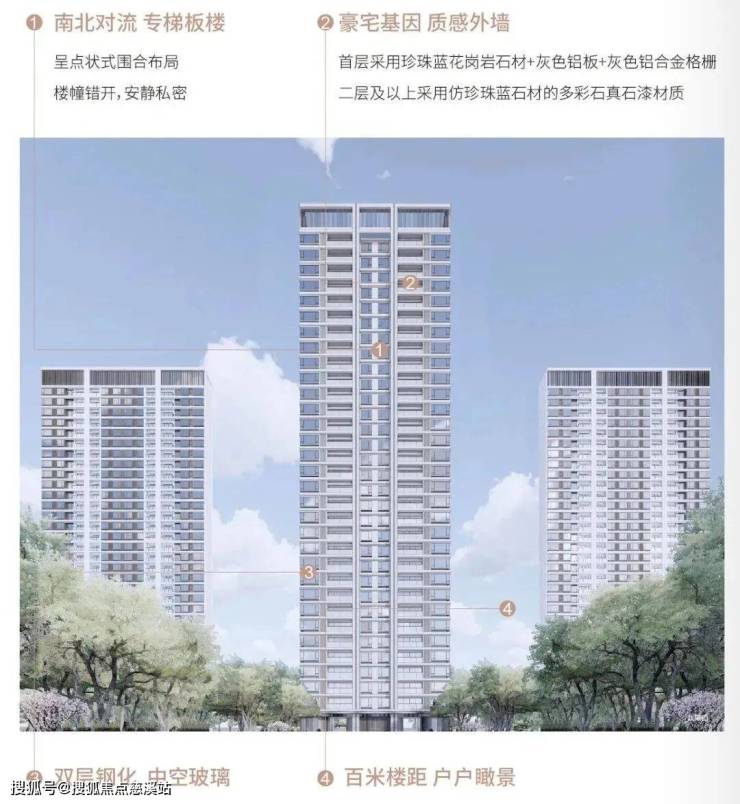 项目采用以深灰与浅灰为建筑主色调的现代简约建筑设计风格,注重居室空间的布局与使用功能的完美结合。外立面采用珍珠蓝仿石漆、水晶灰玻璃、深灰色涂料与深灰色金属百叶的搭配使用,保证建筑的耐久性、稳定性及自洁性,于严苛选材中凝练时光优雅。私密围合布局,一核,一轴,四组团,多节点,户型方正尺度舒适,全景观阳台,户内景观资源视野最大化,地上地下双归家礼仪备享尊崇,打造西区品质标杆。