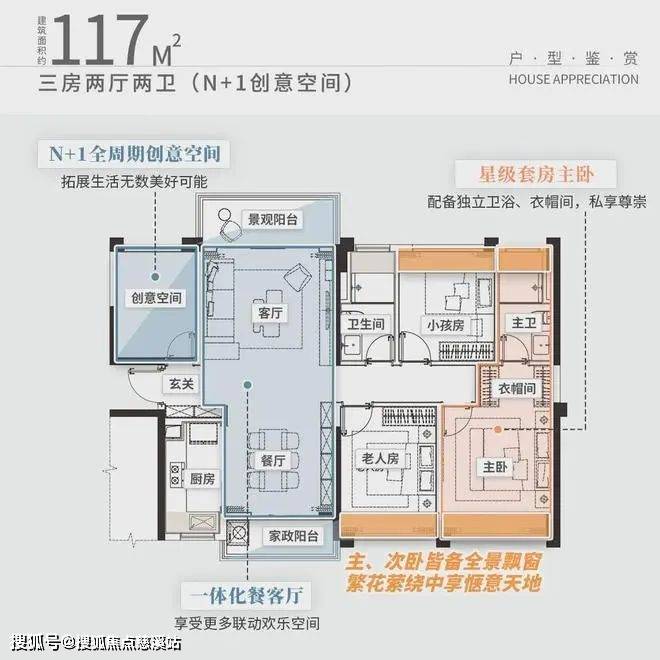而约115-117平3+1户型,则升级为四开间朝南,南北通透双阳台的双面观景格局。