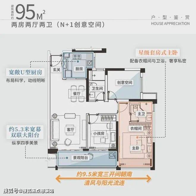 约95方,打造出约5.3米宽幕大阳台,约9.5米三开间朝南观景面。