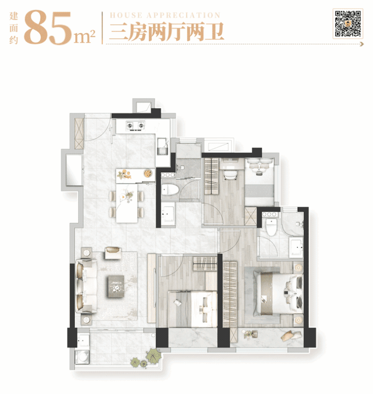 其中,兴格·邻礼阳台率由15%调整为20%;户户双卫,主卧套房设计;优化餐客厨关系;部分飘窗进深由600mm调整为800mm;户户南向瞰景阳台,南北通透。
