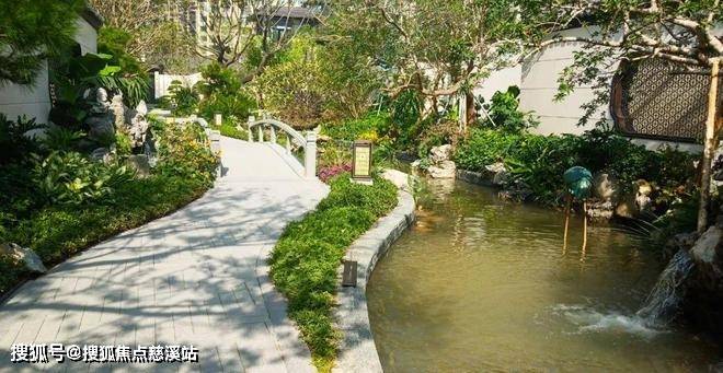 在中轴景观上,每穿过一个类似苏州园林月亮门的拱门,都会呈现一些不同的景致。例如以罗汉松为主题的“松里”,以小桥流水、睡莲游鱼为主要景观装饰的“泛菱”等。