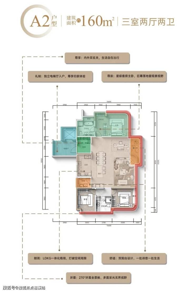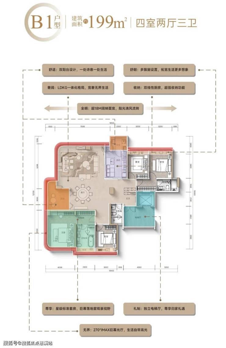 每个户型都做到独立电梯厅、十字轴线体系、LDKG一体化巨厅、中西双厨设计,主卧大套房带270°环幕全景舱。