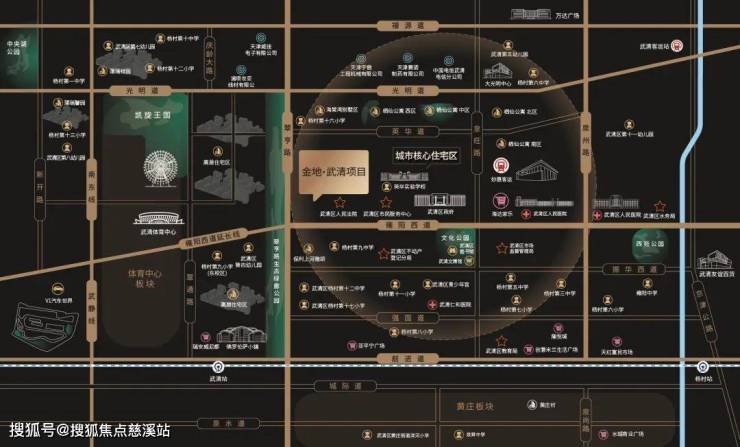 东侧为武清区政府、醇熟城芯,城市价值高地;城西城市配套区,生态、娱乐、运动等资源汇聚于项目一公里范围之内,可触摸的繁华,与看得见的潜能,更加鉴证金地一以贯之的择址观。于此城央贵脉之上,金地又将带来何种惊喜之作?