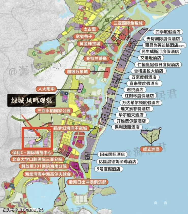 项目位于三亚海棠湾的南区,这个片区偏医疗康养,周边附近有三亚301医院,北京广安门医院和北京口腔医院,附近还有林旺社区,生活购物方便。