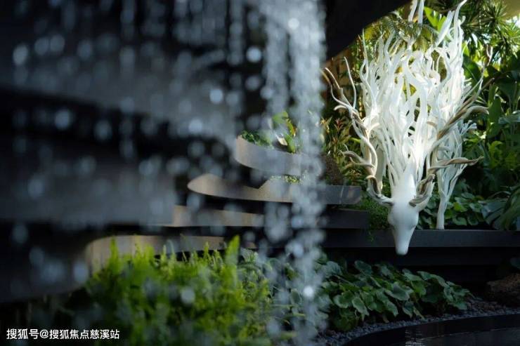 入口门厅如同一片静谧绽放的绿荫,温柔地迎接每一个归家的步伐。层叠流水转角处,忽见一头灵动麋鹿低头饮泉,空间更添一分层次自然之美。