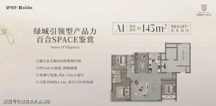 143㎡三/四室:独立玄关+800库收纳空间;约14米面宽;客餐厅连通,约6.75大宽厅;主卧开间约4.1米,带270度拐角落地窗。