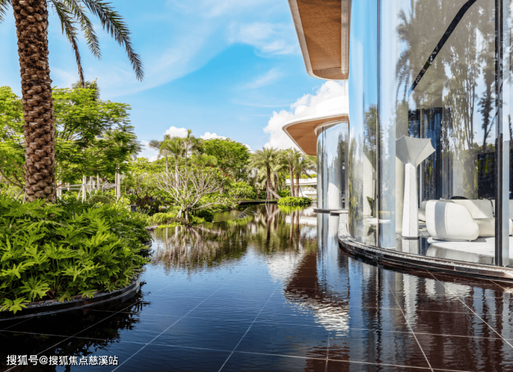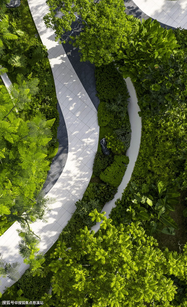 其次,「如水在地」的靈動之感在於線形勾勒。中旅·馥棠公館園林景觀承襲熱帶雨林印象的環境定義,呼應建築靈動的柔美曲線,與綿長的海岸線相映成趣,通過模擬海島的線形勾勒,營造淺灘、溪谷和嶼灣的雨林生境,形成雨林自然的「流動感」,演繹「自然流動,身心調柔,流動無滯,掬水月在手」的美妙意境。