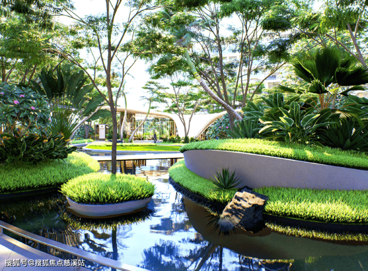 從禮賓大門到歸家園林再到林中花園⋯⋯各個自然場景順著水景串聯起體驗空間,植物組團連成脈絡,延續親水的設計語言和鋪裝,承接連綿水景佈局,賦予多維滲透式的居住體驗。和諧的曲線、流暢的線條,親水性的微妙平衡維持本真狀態,每一處的盈潤環繞、都給足人安心與恬靜,感受到生命裡枝繁葉茂的滋養。