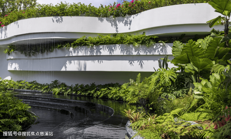 首先,「如雲在天」的意境之美體現在地形建造上。李寶章大師在非山地的土地之上,打造了具有落差層次的園林結構,以此來製造雨林的立體感,通過淺灘、溪谷、嶼灣等豎向層次,構建了「雲台拾趣,似飛雲般奔騰,似晚霞般散播豔麗」的臺地效果。