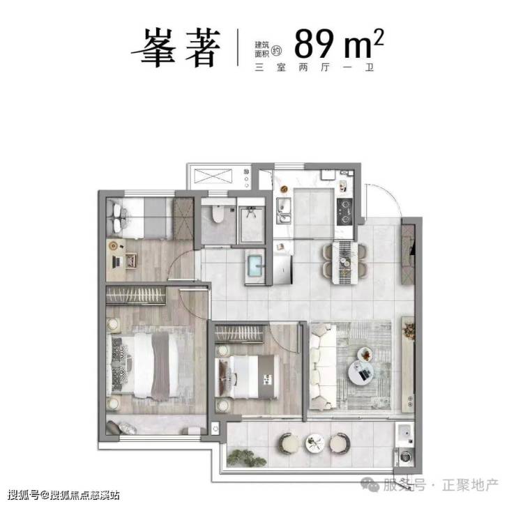 B户型 峯著 三室两厅一卫 | 建筑面积约89㎡,一字型酒店式入户|预设岛台西厨
