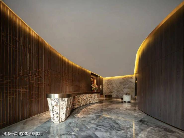 入口两边墙体采用 300 片透光进口石英云母超薄天然石材设计,每片纹理皆不相同,施工时设计师与施工师傅精心挑选、切割、排版后上墙,最终呈现出满屏天然奢石却又疏密得当的立体景墙,极大地提升了业主归家之路的尊贵感 ,完美诠释了 “大面积,多场景,可定制” 的奢石应用理念。