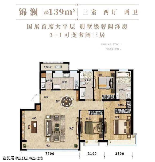 139㎡的三室,分布在景观资源最好的位置上,出房率达84%,7.3米宽厅做到了区域内乃至全市的宽厅产品极致尺寸。这个户型同时实现了全生命周期的3+2可变户型打造;未来可随着业主家庭结构的升级进行成长式变更,同时改造后可实现四开间朝南。餐厅可以安置6人圆桌,尺度上能达到墅级享受。