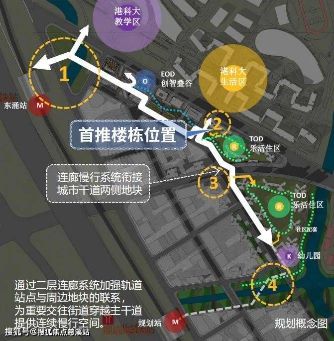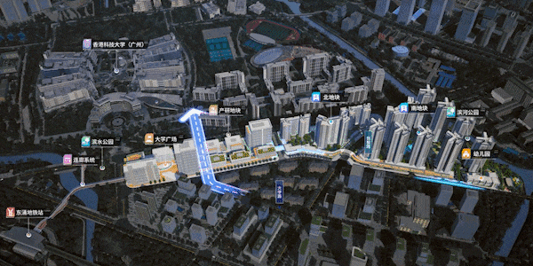 串联港科大(广州)校区、产研园区、东涌地铁站、小区幼儿园和河涌公园,形成一个无边界的“环港科大”生活圈,无惧风雨,步行可达。