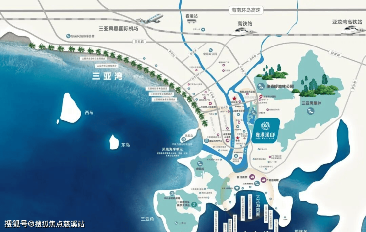 紧邻三亚中央商务区,南面大东海,北面迎宾路,东靠凤凰岭,西面三亚湾、大东海双湾交汇,门前是三亚的母亲河:临春河和三亚河,尽占城芯地利,矜贵地脉,以城芯、半山、瞰海、临河的天际视野,著写当世向往。