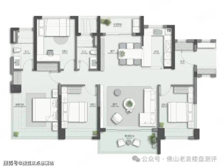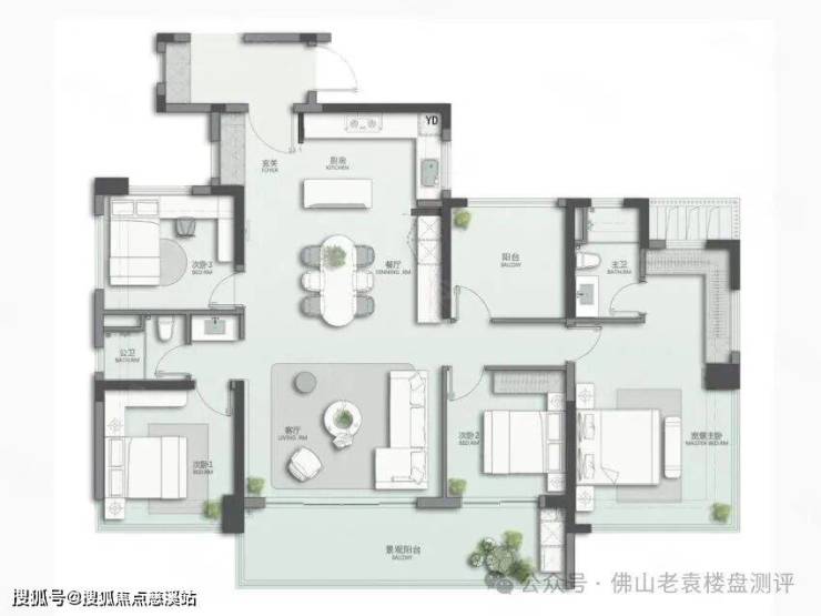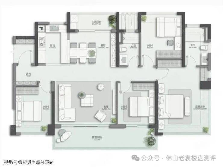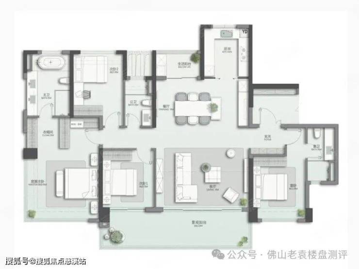 项目主打纯改善产品,当前主推 1/6 栋,采用 2 梯 3 户 / 2 梯 4 户低密梯户比设计,主力户型为建面约 123-168㎡四至五房,全精装交付。核心亮点是极致运用佛山新规 30% 阳台赠送政策,户型使用率高达 106%-112%,远超市场常规水平。