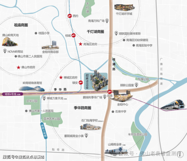 轨道交通:直线约 800 米可达已运营的佛山地铁 3 号线镇安站,直线约 1 公里为在建 4 号线石啃站(预计 2030 年通车),双地铁覆盖广佛通勤。