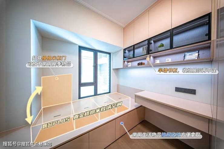 在保利和著这个卧室里,就连一个榻榻米都极具匠心,靠窗的区域由于没有传统飘窗阻碍,是直接落地的,打开柜门就可以放换季物品,床边的位置做了抽屉,拿取日常用品不用掀开床垫。