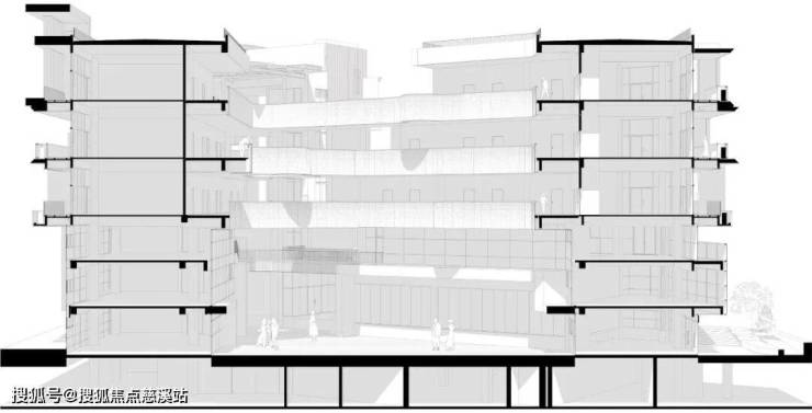 主要面对湿地公园 ?这虽自然,但会忽视北侧的入口关系;若优先营造街道立面,又容易使建筑背对公园,姿态消极。我们试图兼顾两者。我们尝试采用S型的体量,相互缠绕,从而创造两个庭院空间,并形成穿过建筑的通道。西侧的庭院和道路相连,形成类似城市广场的放大节点;东侧的中庭更具探索性,同时向上和向后延伸连接南侧的公园。两个庭院通过部分下沉的空间来连接,不仅提供了宝贵的阴凉,更在公园与街道间构建了一条“洄游”路径。行人可在此自由穿梭,体验探索的乐趣,弥补了新区所缺失的宜人步行感受。