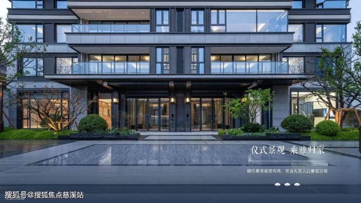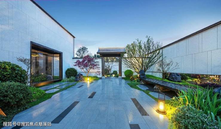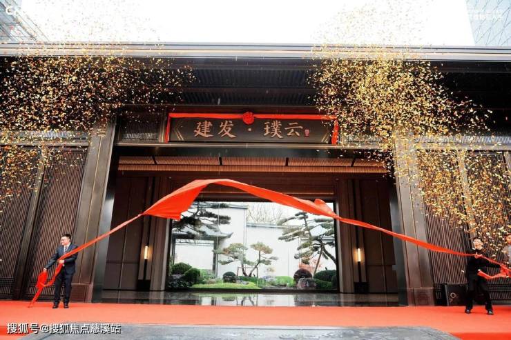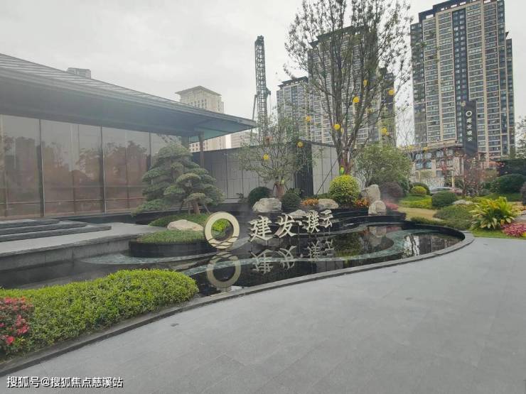 建发房产标志性“新中式”建筑风格,外立面采用飞檐翘角、中式格栅与现代材质结合,搭配中式园林景观(含假山、流水、亭台),强调“东方美学与现代生活”的融合。