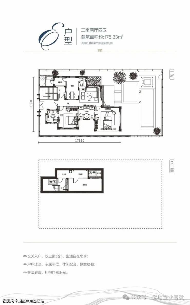 E户型规划面积约175㎡,实得约286㎡,院子190-480㎡