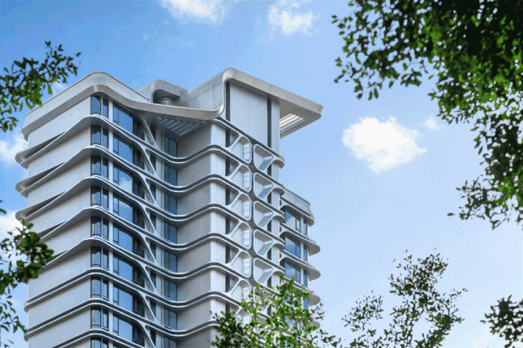 保利·国贸天琴采用游艇廊架结合厦门鲜明的海洋文化,造型设计融合了游艇、海浪、钢琴、白鹭等元素,把流体美学植入建筑立面。