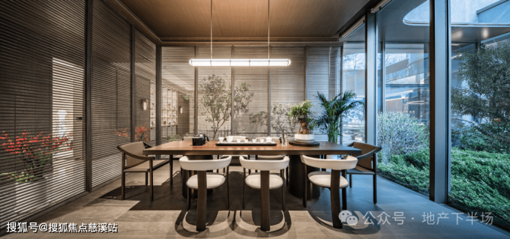 坐在下沉会所里,大面积无边隐框玻璃幕墙将下沉庭院的曼妙风光引入室内。约6m高的悬瀑飞流直下,层次分明的叠水景观,与精心挑选的名贵乌桕,共同绘制出一幅细腻立体的多维山水庭院。