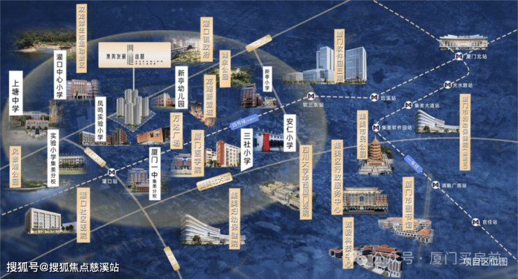 片区内学府林立,凤鸣实验小学、新亭幼儿园、厦门实小(集美分校)、厦门一中(集美分校)、厦门医学院等重点学区环伺。8分钟半径学府圈: