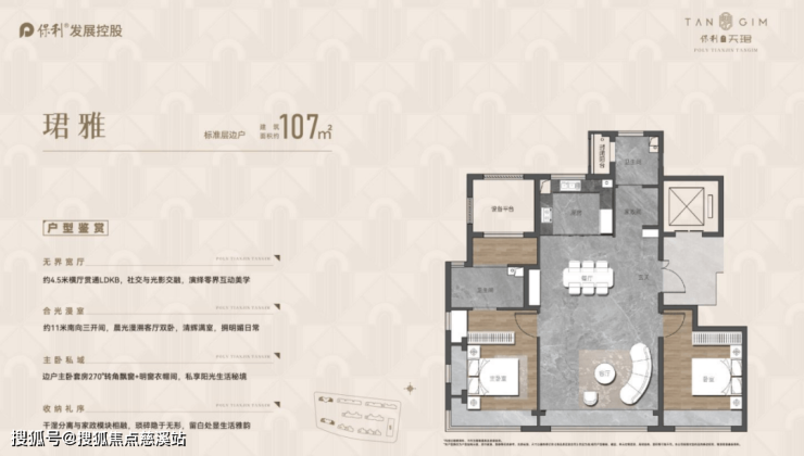 起步107㎡户型,把纯粹价格敏感的书包客户挡在了门外,也无形中拉高了项目改善的门槛,户型尺度又是可进可退的选择,正中学区兼顾改善客户的下怀。