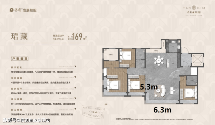 169户型没有样板间,但必然是靠抢的产品,只有18套,更重要的是天津市场上唯一以169㎡做到四房三卫双套房宽厅的产品。面宽6.3米,南向三个卧室最小面宽都在3.2米以上,主卧卫生间更是奢侈到一间次卧的尺度,实得房率高达97%。随便一组数据都能冲击市场,更何况作为整个项目的压轴产品,精装标准是天系塔尖。如果在河西买改善,洋房、大尺度、高标精装这个户型绝对是不二之选。