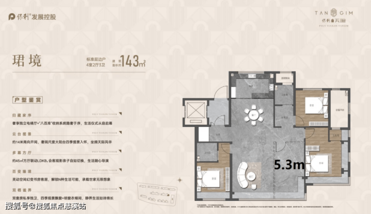 保利津门天珺标准层最大户型是四室三卫宽厅的169㎡,顶跃产品接近200㎡,纯改善定位无疑,未来会在实体楼呈现。目前样板间最大143㎡,同样是可变四室三卫,但升级了双套房。