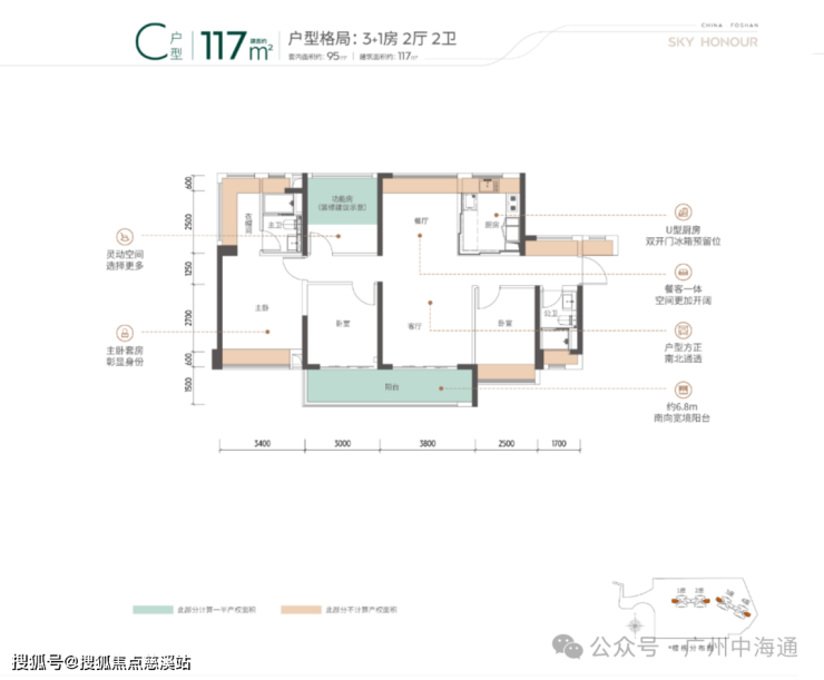 约117㎡四房 :6.8 米大阳台 + 小家化主套(独立衣帽间 + 化妆区),女主人狂喜!四房空间适配二胎、三代同堂,一步到位 。