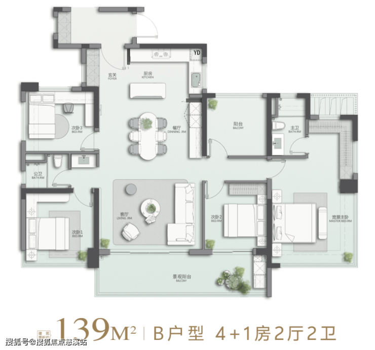 139㎡B户型的创新之处在于可实现4+1房设计,北侧阳台被巧妙预留为X空间,业主可根据需求将其打造成书房、健身房、儿童游乐区或电竞房。若客厅连通次卧打通,该户型依旧能保留4房的设计格局,灵活适应不同家庭结构的需求。