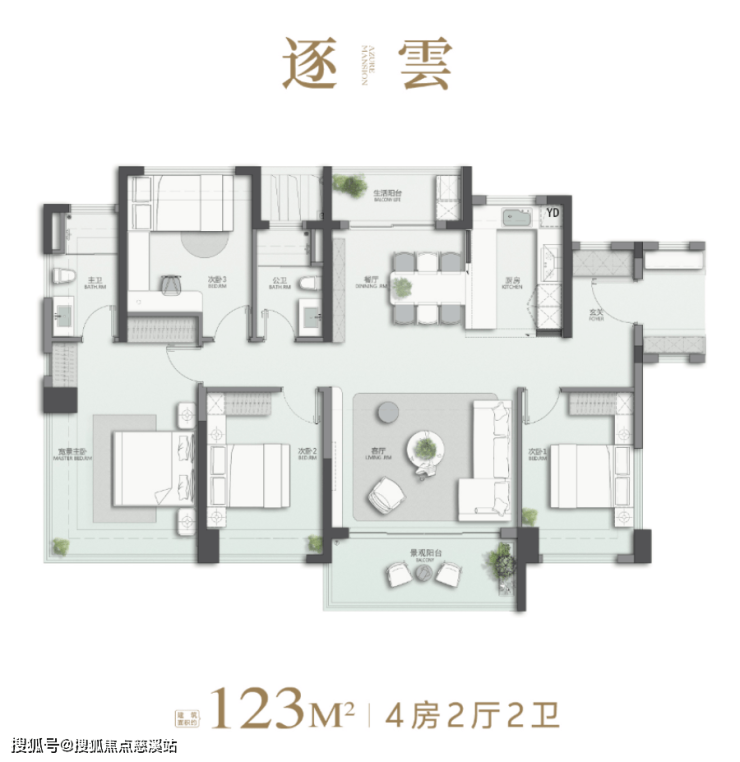 招商青雲臺的123㎡户型作为项目的起步户型,堪称改善四房的“性价比之王”。该超新规户型为四房两厅两卫设计,使用率高达112%,奢阔尺度可媲美市面上140㎡以上户型。户型集双入户玄关、南北双阳台、卧室平权等亮点于一身。南北通透双阳台设计,生活阳台收纳琐碎,景观阳台则可封窗实现真正的LDKG一体化。