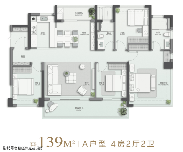 139㎡A户型可理解为123㎡户型的升级版,保留南北双阳台设计,主阳台双开间约8米宽。